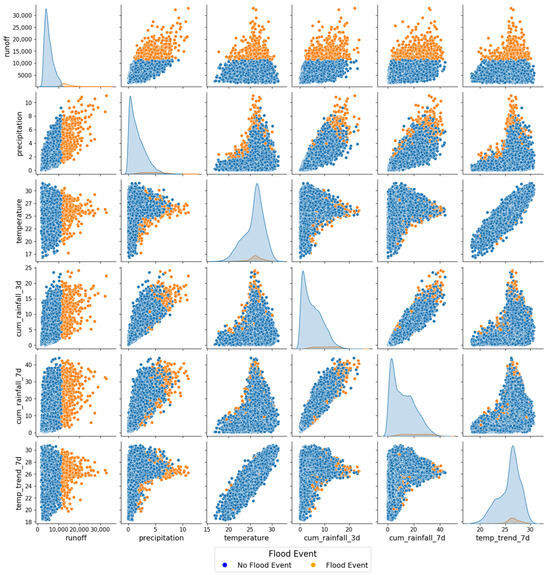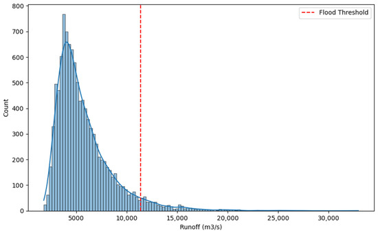 After creating these engineered features, the next stage is to define flood events. In this step, the threshold for flood events is defined based on the 95th percentile of the ‘runoff’ column. The use of the 95th percentile to define the flood threshold in the analysis is based on both statistical and hydrological reasoning. Statistically, this threshold is part of Extreme Value Theory (EVT), which focuses on extreme events by capturing the upper tail of the runoff distribution, ensuring that only the most significant 5% of high flow events are classified as floods [65]. Hydrologically, it aligns with the flow duration curve (FDC) methodology, often used in water resource management, where the 95th percentile is a balance between capturing too many non-extreme flows at lower percentiles and only the most catastrophic events at higher percentiles [66]. This threshold is widely used in flood analysis for being robust in identifying significant but not excessively rare flood events [67,68]. A new binary column, ‘flood_event’, is then created to indicate whether a flood event occurred.