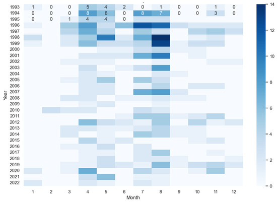 Frequency of flood events from 1993 to 2022 with the x-axis representing months (1 to 12) and the y-axis representing years.