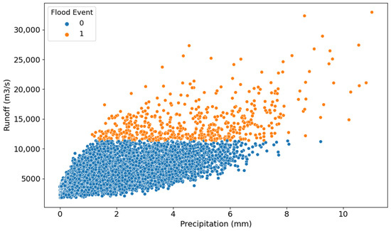 Figure 8 shows the relationship between precipitation (in mm) and runoff (in m3/s), distinguishing flood from non-flood events. Each data point represents an observed value pair of precipitation and runoff. There is a positive correlation between precipitation and runoff, with flood events occurring mostly above 10,000 m3/s. Non-flood events are concentrated at lower runoff and precipitation values. The plot highlights that runoff values exceeding 10,000 m3/s are strongly associated with floods, aiding in flood risk assessment and prediction based on precipitation and runoff levels.