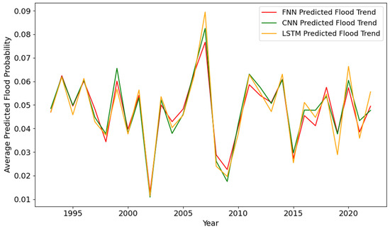In the next stage, flood probabilities for the test set are predicted using the trained FNN, CNN, and LSTM models. Predicted probabilities from the FNN, CNN, and LSTM models are added to the dataset for further analysis. Then annual average predictions for each model are calculated by grouping the data by year. These predictions are smoothed using the Savitzky–Golay filter to highlight trends over time [69].