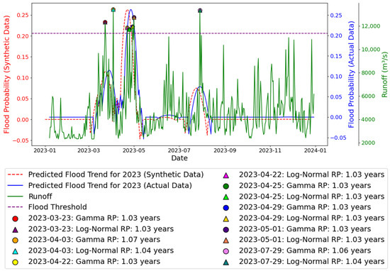 Deep neural network ensemble (DNNE) predicted flood probability for 2023 using synthetic data and actual data, along with the observed runoff, flood threshold, and flood events and their respective Return Period (RP) with Gamma and Log-Normal distribution.