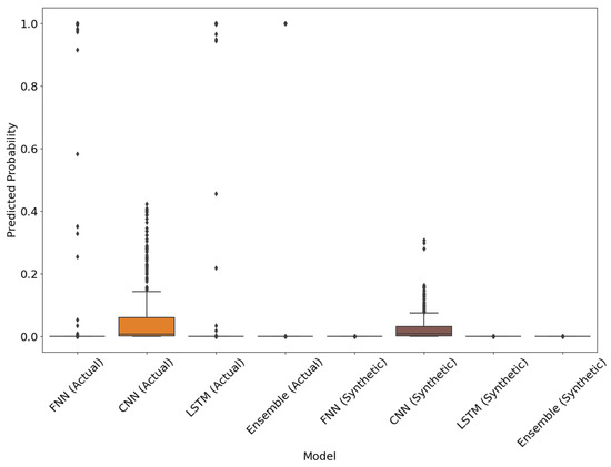 The performance metrics of the different models—FNN, CNN, LSTM, and Ensemble—reveal distinct levels of efficacy across actual and synthetic data. The Ensemble model achieves perfect accuracy (1.000000) and ROC AUC (1.000000) on actual data, indicating flawless performance, though it shows a slight drop in ROC AUC (0.748889) on synthetic data while maintaining high accuracy (0.986301). The LSTM model also demonstrates excellent performance with near-perfect accuracy (0.998627) and ROC AUC (0.999986) on actual data and maintains strong performance on synthetic data with an accuracy of 0.986301 and ROC AUC of 0.941667. Similarly, the FNN model achieves high accuracy (0.997712) and ROC AUC (0.999948) on actual data, with slightly lower but still strong results on synthetic data (accuracy 0.986301, ROC AUC 0.951667). In contrast, the CNN model exhibits lower performance with an accuracy of 0.954691 and ROC AUC of 0.892747 on actual data, and although it maintains high accuracy (0.986301) on synthetic data, its ROC AUC drastically drops to 0.215000, indicating poor distinguishing power. Thus, the ranking from the best to worst model, based on the combined performance on both datasets, is: Ensemble, LSTM, FNN, and CNN. The model performance is consistent with the results before introduction of the ensemble, implying the models are well trained and perform as expected.