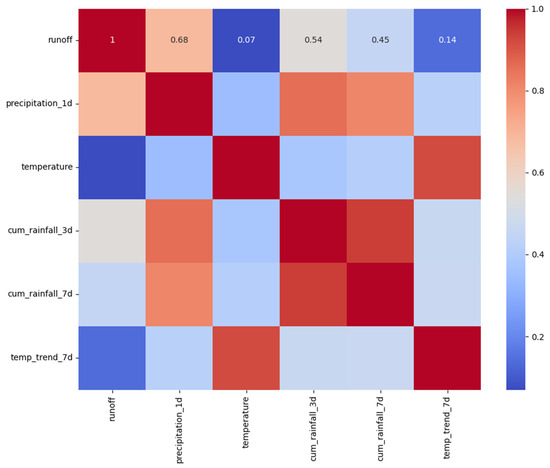 The predictor features for flood event prediction were meticulously curated from thirty years of daily data to provide diverse and comprehensive information. This careful selection allowed the deep learning models to learn efficiently and effectively, capturing intricate patterns and relationships essential for accurate flood probability prediction. Flood event prediction for daily occurrences over a thirty-year period and flood probability predictions for monthly and yearly occurrences hinged heavily on the relationships between the predictor variables. These correlations helped to understand the strength and direction of relationships between variables, which was essential for construction of the predictive deep learning models that accurately reflect the underlying data patterns. The correlation matrix heatmap (Figure 13) visually represents the pairwise correlation coefficients between runoff, precipitation, temperature, cumulative rainfall over 3 days (cum_rainfall_3d), cumulative rainfall over 7 days (cum_rainfall_7d), and the temperature trend over 7 days (temp_trend_7d). The coefficients range from −1 to 1, where 1 indicates a perfect positive correlation, −1 a perfect negative correlation, and 0 no correlation. Runoff is highly correlated with precipitation (0.68) and moderately with cum_rainfall_3d (0.54) and cum_rainfall_7d (0.45), indicating that precipitation and cumulative rainfall significantly impact runoff. Precipitation also moderately correlates with cum_rainfall_3d and cum_rainfall_7d but shows weak correlations with temperature and temp_trend_7d. Temperature and its 7-day trend have weak correlations with all variables, indicating minimal impact. Cumulative rainfall over 3 and 7 days are strongly correlated, reflecting their interrelated nature. In summary, runoff is mainly influenced by precipitation and cumulative rainfall, while temperature and its trend do not significantly affect the other variables. Du et al. [70] found similar conclusions when examining the correlation between runoff, rainfall, and temperature. Du et al. [71] also reported that temperature only significantly affects runoff in winter months or very cold regions, such as mountainous areas. While this is not relevant to the Nile basin case study, temperature will be more significant for research in regions that experience winter or are located in cold mountainous areas.