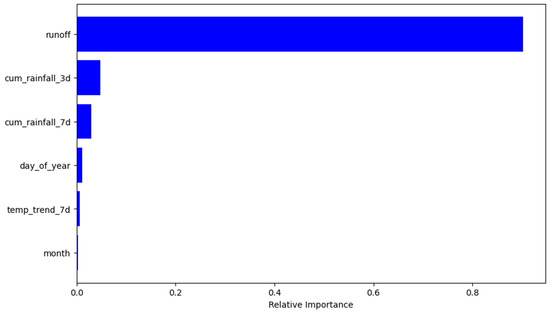 In this methodology, raw data is transformed into more informative features to improve model performance. For example, date-based features such as ‘day_of_year’, ‘month’, and ‘year’ are derived from the ‘date’ column to capture temporal patterns. Additionally, cumulative rainfall over 3 and 7 days and a 7-day moving average of temperature are calculated to reflect trends and accumulated weather effects on runoff and flood events. These engineered features (feature engineering) provide the models with relevant patterns from the data, enabling more accurate predictions. Cumulative rainfall over 3 days is the short-term accumulated rainfall that indicates immediate flood risks, useful in capturing recent heavy rain events likely to cause floods [61]. Cumulative rainfall over 7 days shows the medium-term accumulated rainfall to capture trends leading to flood conditions, helping understand the buildup of water over a longer period which could lead to flooding [62]. The temperature trend over 7 days, which is the average temperature over a week, helps understand the evaporation and other temperature-dependent processes affecting runoff [63]. Finally, the feature engineering process involves handling missing values, where rows containing Not a Number (NaN) values resulting from the rolling window calculations are dropped [64].