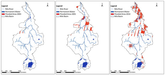 One way to visualize flood events is utilizing Normalized Difference Vegetation Index (NDVI) change detection to detect floods [72]. In vegetated areas, a flood causes the NDVI to drop sharply because water absorbs more in the NIR band and reflects less in the red band compared to healthy vegetation [73]. Pixels with a decrease in NDVI values below a threshold indicate flooded areas, as water presence significantly reduces NDVI, making NDVI useful for detecting water in previously vegetated areas due to its sensitivity to changes in the NIR and RED bands [74,75]. The NDVI was derived from Landsat 7 satellite images (Table 1). The flooded area relative to basin size was also computed as: 2003 (0.2%), 2001 (3.4%) and 2014 (10.3%) as shown in Table 2. The highest return period registered the lowest flooded area and vice versa. Flood probability prediction demonstrates the effectiveness of deep learning neural networks and a deep learning ensemble in accurately forecasting flood probabilities for 2023, utilizing feature relationships and historical data from the 30-year period between 1993 and 2022. Ghimire et al. [76] concurred that deep learning ensembles outperform individual deep learning models and affirmed the superiority of deep neural networks over conventional neural network models. Similarly, Yuan et al. [77] acknowledged the advantage of deep learning models over standard neural networks. This underscores the novelty and significance of the research, demonstrating that this effective approach can enable communities to prepare for potential flood events at least a year in advance. This not only facilitates long-term flood forecasting but also helps establish an extended flood warning system.