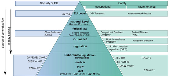 These explained concepts provide a general assessment of resilience for a utility. However, the reliability of the treatment process is of key importance. Therefore, Walker and Salt [22] additionally refer to the terms general and specific resilience. In this case, specific resilience would focus on one process or process step in the wastewater treatment of a WWTP [23,24]. In addition to the EU RCE, there are other regulations concerning the safety of CIs. The next chapter provides an overview of these regulations at the EU and national levels to better understand the requirements for WWTP operators.