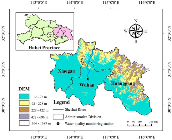 The Sheshui River, a tributary of the Yangtze River, originates from Sanjiao Mountain in Dawu County, Hubei Province, and flows through Dawu County, Hong’an County, and Huangpi District before merging into the Yangtze River near Wuhan. The Sheshui River is 142.14 km long and has a watershed area of 2312 km2. As a crucial drinking water source, the Sheshui River supplies potable water to approximately 700,000 people along its banks. Therefore, predicting the temporal variations in water quality indicators in the Sheshui River is of significant importance for understanding water quality dynamics and supporting regional economic development.