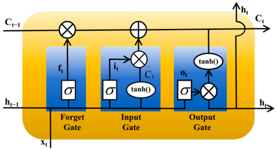 LSTM is a special type of Recurrent Neural Network (RNN) with excellent performance in capturing long-term dependencies in time series data. Compared to traditional RNNs, LSTM introduces three gating units (forget gate, input gate, and output gate) and a cell state, which effectively address the issues of vanishing and exploding gradients, allowing the network to maintain stable training performance over longer time sequences [47]. The structure of the LSTM hidden layer is shown in Figure 3.