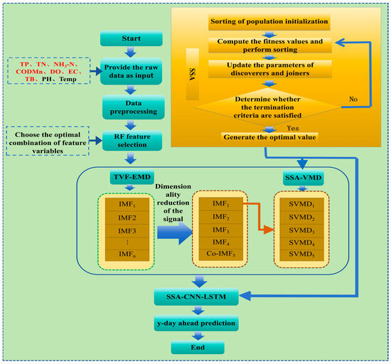 To address this issue, this study proposes a coupled prediction model that integrates multi-level decomposition and deep learning techniques, including RF, TVF-EMD, VMD, Sparrow Search Algorithm (SSA), CNN, and LSTM. The model aims to effectively resolve the incomplete decomposition problem in traditional models and enhance water quality prediction accuracy. Specifically, the study first employs Random Forest (RF) [26] for feature selection, followed by initial signal decomposition of water quality data using TVF-EMD. The most complex IMF components, with the highest noise, are then subjected to a secondary decomposition using VMD. Finally, the CNN-LSTM model is applied to predict the high and low-frequency decomposed data, with the parameters of VMD and CNN-LSTM optimized using the SSA [27]. This paper evaluates the prediction performance and generalization capability of the proposed model using the total Phosphorus (TP), total Nitrogen (TN), ammonia nitrogen (NH3-N), DO, permanganate index (CODMn), electrical conductivity (EC), and turbidity (TB) indicators from the Sheshui River in the Yangtze River Basin, across different lead times of 1, 3, 5, and 7 days.