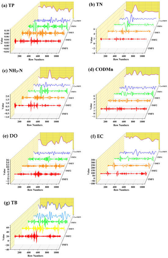 Sample entropy is an algorithm used to characterize the complexity of a signal’s time series [50]. A sample entropy value closer to 0 indicates that the time series is simpler and more regular. A larger sample entropy value indicates that the time series is more prone to change, meaning it is more complex, less stationary, and less predictable. After the TVF-EMD decomposition, the sample entropy of the IMFs generated for each indicator was calculated, with the results shown in Table 3. The complexity of the IMFs for each indicator gradually decreased and eventually stabilized. To improve the efficiency of the prediction model and reduce the total number of prediction sequences, dimensionality reduction was performed. Based on the entropy values, IMFs obtained from IMF5 to IMF8 (or IMF5 to IMF7) were reconstructed into Co-IMF5. The decomposition results of the indicators after signal dimensionality reduction are shown in Figure 5.