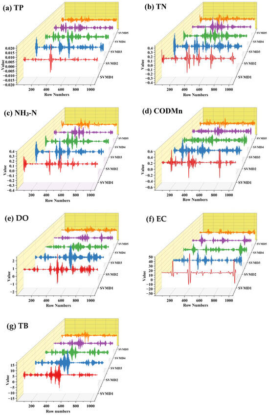 The main parameter settings were as follows: the SSA algorithm used a population size of 20 and 50 iterations; the VMD algorithm had a penalty factor α range of [500, 3000], k was set to [3, 12], the noise tolerance τ was set to 0, the direct current component was set to 0, the initial modal center frequency was set to 1, and the control error tolerance was set to 10−7. Using SSA-VMD, IMF1 of all indicators was further decomposed into 5 IMFs. The decomposition results are shown in Figure 6.