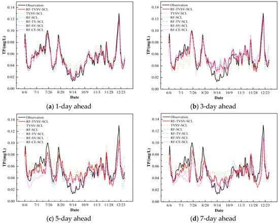 To fully validate the performance of the RF-TVSV-SCL model, five comparison models (TVSV-SCL, RF-SCL, RF-TV-SCL, RF-SV-SCL, and RF-CE-SCL) were established. In these model names, RF, TVSV, and SCL represent the Random Forest feature selection module, dual decomposition module based on TVF-EMD and SSA-VMD, and the prediction module based on SSA-CNN-LSTM, respectively. TV, SV, and CE represent TVF-EMD, SSA-VMD, and CEEMDAN, each being a single decomposition module. The parameters for CEEMDAN were set as follows: standard deviation threshold = 0.2, iteration count = 500, maximum iteration count = 5000, with all other parameters set to default. All other models retained their parameter settings the same as those of the RF-TVSV-SCL model. Taking TP as an example, Figure 7 and Figure 8 illustrate the test set predictions of different models for 1, 3, 5, and 7-day forecast periods. The prediction results for other indicators (TN, NH3-N, DO, CODMn, EC, and TB) are presented Figures S1–S6 and Table S1 in Supplementary Information.