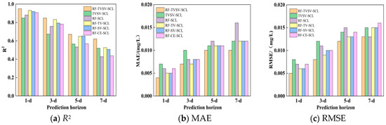 Furthermore, based on the comparison of predicted and actual observation values in Figures S1–S6 and the prediction accuracy shown in Table S1 in Supplementary Information, the RF-TVSV-SCL model exhibited the best prediction performance among all tested models for the other six water quality indicators (TN, NH3-N, DO, CODMn, EC, and TB). It also excelled in water quality predictions for 1–3 day forecast periods. Specifically, for the 1-d forecast period, the R2 values for these six indicators were 0.951, 0.958, 0.949, 0.953, 0.930, and 0.941, respectively; for the 3-d forecast period, the R2 values were 0.810, 0.798, 0.836, 0.820, 0.786, and 0.870, respectively; and for the 5-d forecast period, the R2 values exceeded 0.7 for all indicators except DO and EC.