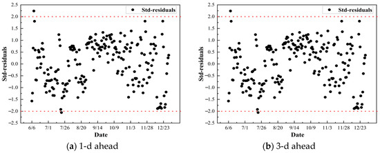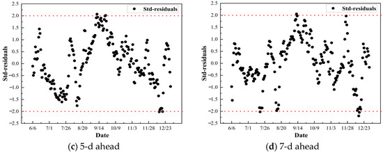 Figure 9 shows the distribution of standardized residuals for the RF-TVSV-SCL model in predicting TP across different forecast periods. In all four forecast periods, more than 95% of the residuals fell within the confidence interval of [−2, 2] (i.e., the area between the two red dashed lines in Figure 9), indicating that the model performed well in all forecast periods. However, the model demonstrates higher accuracy and stability in short-term forecasts (1–3 d). As the forecast period extends, while the majority of residuals remain within the confidence interval, the errors gradually increase, and the model’s predictive stability declines, particularly in the 5-d and 7-d forecast periods.
