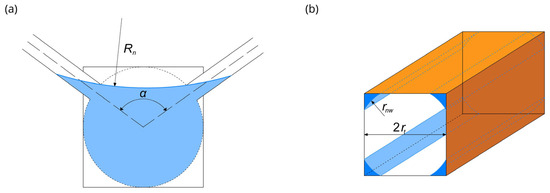 Furthermore, the capillary pressure applied during drainage, (Pa), is suitable for calculating the radius of curvature of the water film in the corners of the pore throats and bodies (Figure 1b):