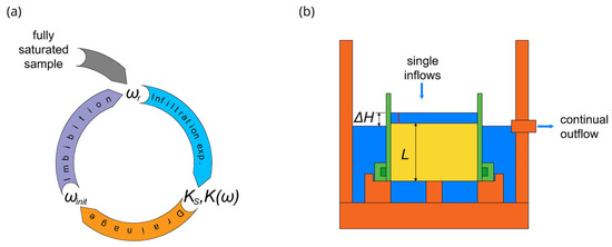 The second experiment [55] consisted of a series of drainage–imbibition cycles to study the relationship between the entrapped volumetric air content and the saturated and satiated hydraulic conductivity (Figure 2a).