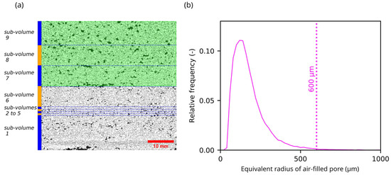 Description of the procedure in which the maximal µCT determined air-filled pore radius was obtained from µCT images. (a) Example of µCT vertical cross section. Air-filled pores are presented in black color. The region of interest used for the calculation of the largest bubble-formed pore is the upper half of the sample (the green region). The sub-volumes numbered from 1 to 9 are sub-networks represented in the model by different parameters of the pore network. (b) Histogram of the µCT determined air-filled radii formed by air bubbles obtained for the upper half of the sand sample. The radius was determined from the volume of µCT determined air-filled pores with the assumption of its spherical shape.