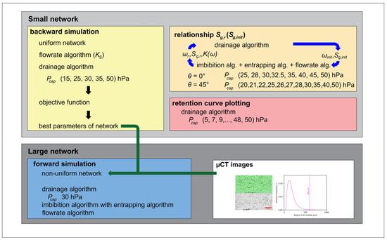 We simulated both the drainage and wetting of water in the sand sample as a flow of an invading fluid phase towards a defending phase that is initially present in the network. This process is described by invasion percolation and simulated by considering two key parameters: the entry pressure and the conductivity of the individual network elements, namely the pore bodies and throats.