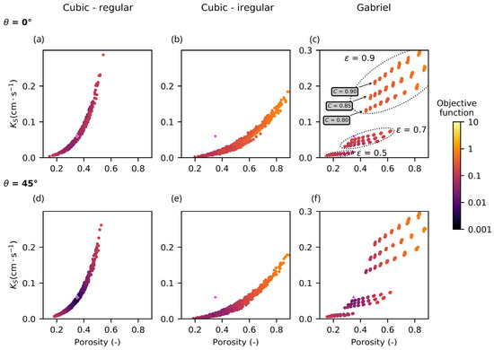 Comparison of the results simulated for three pore network configurations. The columns (a,d), (b,a), (c,f) correspond to the three network generation approaches and the rows (a–c), (d–f), correspond to the two values of the contact angle. The magenta cross symbol shows the Ks values determined in laboratory experiment. The color of the other points represents the value of the objective function . The plots with the results of Gabriel’s approach exhibited a higher range of KS values.