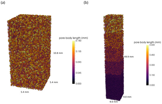 Figure 6 shows examples of networks generated for backward and forward simulations with parameters used for numerical simulations. The small network, with sizes 5.4 × 5.4 × 10.8 mm3, contains 54,000 pores bodies and the large network, with sizes 9 × 9 × 50 mm3, contains over 250,000 pores.