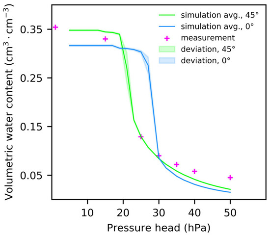 A comparison of the simulated and measured retention curves is shown in Figure 7. A better agreement was obtained for θ = π/4 with porosity close to the measured value.