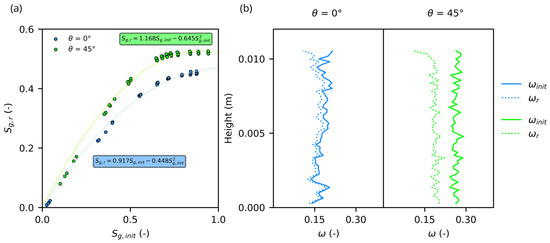 Furthermore, the relationships between the residual gas saturation of the satiated sample, Sg,r (-), and the initial gas saturation, Sg,init (-), are shown in Figure 8a. The maximum of Sg,r was equal to 0.45 for θ = 0 and 0.52 for θ = π/4. The dotted lines show the fit of the quadratic model by [57]. There is an approximately linear growth of Sg,r(Sg,init) for lower values of initial gas saturation to the value over 0.5. Furthermore, the growth rate of the amount of entrapped air decreases significantly as the initial gas saturation increases. The general shape of the relationship is in good agreement with the findings of Pentland [58] and Kazemi [59]. Figure 8b shows the difference between the air distributions in the networks created for both contact angles for pressure head equal to 30 hPa.