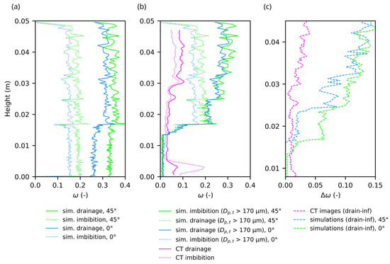 The drainage and spontaneous imbibition cycles were performed (Figure 2a). Drainage was carried out on a sand table with the given pressure head. The value of ωinit was obtained gravimetrically, by weighing the container with the sand column after drainage. Imbibition after each drainage step was performed by flooding the sample upwards through the bottom. By filling the outer container to the standard level, it was possible for each step to determine the mass of water replaced by the trapped air relative to the initial fully saturated state and to calculate ωr. The satiated hydraulic conductivity (hydraulic conductivity at the actual residual gas saturation) K(ω) was measured after each imbibition using the same falling head method as used for the measurements of Ks. A total of ten drainage and imbibition cycles were completed. Furthermore, three-dimensional X-ray µCT images of the sample in the drained and flooded (saturated or satiated) states were recorded for two additional cycles. The experiments were detailed in [55].