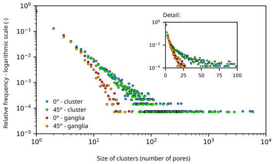 The algorithm used the reverse sequence of the water pore filling, obtained from the imbibition algorithm. Generally, groups of connected pores filled with the defending phase (air) were created, and each group was labeled with a label number. Three situations could have occurred in each step when one goes backward in time [55]: (i) The number of clusters with defending phase stays the same—the cluster (with label 0 or greater) can grow, (ii) new cluster of size equal to one is created and assigned a new cluster label number, which is incremented by one, (iii) multiple clusters merge into one cluster with a single label number that is equal to the maximum of the label numbers of the merged clusters.