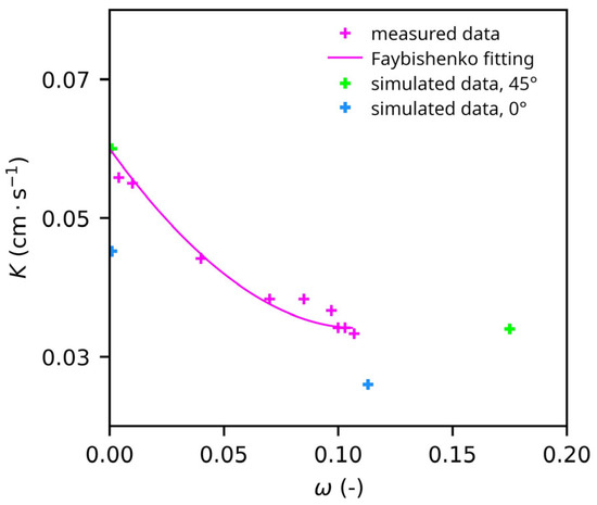 where Q (m3∙s−1) is the flow rate across the top and bottom boundaries, A (m2) is the cross-sectional area, L (m) the length of the sample, and H (m) is the hydraulic head difference. In the case of the presence of entrapped air in the pore medium, the result corresponded to a satiated hydraulic conductivity, K(ω) (m∙s−1) with volumetric entrapped air content ω.