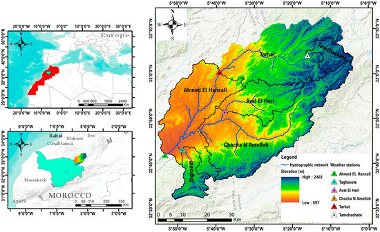 The Upper Oum Er Rbia (Upper OER) watershed is part of the Middle Atlas [68], and is situated in three distinct geographical areas: the Western Meseta, the Middle-Atlasic Dir and valleys, and the Middle-Atlasic cause [69]. This explains the varying altitudes, which range from 600 m in the southwest to 2400 m in the northeast. This basin encompasses four main wadis: Ouaoumana, Srou, Chbouka, and the most important, Oued Oum Er Rbia. These wadis accumulate at the Ahmed El Hansali dam. The primary source of water flow in this watershed is snowmelt, which significantly contributes to both surface and groundwater recharge [70]. In this study, the Upper Oum Er Rbia basin was divided into six sub-basins (Figure 1).