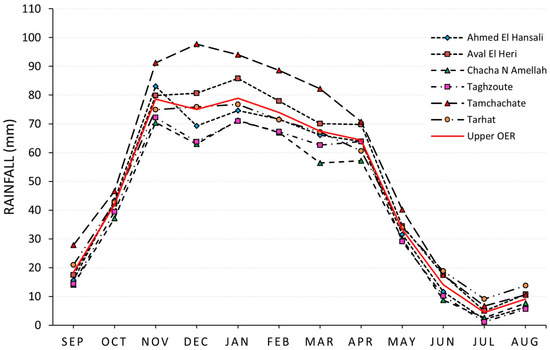 The Upper Oum Er Rabia (Upper OER) watershed data were provided by the Oum Er Rabia Hydraulic Basin Agency (OERHBA) [71]. The dataset comprises a time series of monthly rainfall from 1979 to 2022, recorded at six rainfall stations, namely: Ahmed El Hansali (AEH), Taghzoute, Chacha N Amellah (ChachaNA), Aval El Heri (AEHeri) Tarhat and Tamchachate. The Upper OER basin receives an average annual precipitation of 559.3 mm. Among the sub-basins, the Tamchachate station records the highest rainfall at 673.9 mm/year, while the ChachaNA station records the lowest at 485.5 mm/year. The graph (Figure 2), displaying the monthly interannual rainfall variation at the sub-basin level, indicates two distinct periods: wet and dry. The wet season spans from November to April, while the remaining months are considered dry (May–October).