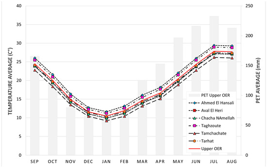 In 2019, the European Centre for Medium-Range Weather Forecasts (ECMWF) unveiled the ERA5 product as part of the Copernicus Climate Change Service [72]. ERA5 represents the fifth generation of ECMWF reanalysis products [73], following ERA-Interim [74], ERA-40 [75], ERA-15 [76], and FGGE [77]. ERA5 encompasses the period from 1950 to the present day, with a spatial resolution of 31 km and a temporal resolution of up to one hour [73]. The used data were obtained from the ClimateEngine platform (https://app.climateengine.com/climateEngine, accessed on 13 December 2023) free of charge and with a daily time step and a spatial resolution of 0.25° × 0.25°. In order to align with the observed data, the dataset was resampled with a monthly temporal resolution from 1979 to 2022. The graph (Figure 3) displays the average monthly temperatures and potential evapotranspiration, highlighting two extreme periods: a cold period in December–January–February and a hot period in July–August–September. Tamchachate station records the lowest temperatures, while Ahmed El Hansali and Taghzoute stations record the highest.