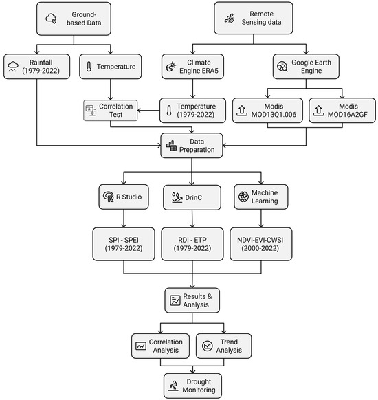 In order to achieve this objective, data from meteorological stations was used to calculate SPI, SPEI, and RDI, using RStudio 23.12. Build 402 and DrinC Version 1.7, for a period of 44 years, from 1979 to 2022. These data comprised precipitation data from meteorological stations and temperature data from ERA5 products. Remote-sensing products were used to obtain NDVI, EVI, and CWSI data using Google Earth Engine (https://earthengine.google.com, accessed on 28 March 2024) over the 2000–2022 period (Figure 4). Subsequently, a series of statistical tests were applied to the various datasets, including correlation tests and a trend analysis by Mann–Kendall and Sen’s Slope.