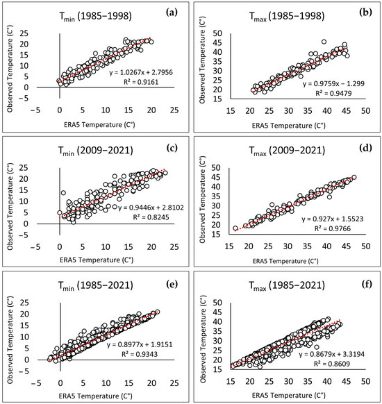 Correlation graphs between observed temperatures and ERA5 product temperatures: (a–d) Ahmed El Hansali station and (e,f) Tarhat station.