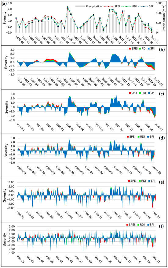 (a) Annual precipitation, SPEI, RDI and SPI, (b) annual, (c) 12 months, (d) 6 months, (e) 3 months, and (f) 1 month.