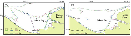 Isobaths of Haikou Bay. (a) Comparison of 0 m, 5 m, and 20 m isobaths; (b) comparison of 2 m and 10 m isobaths.