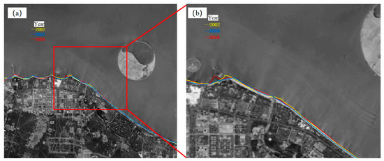 Comparison of historical shorelines in Haikou Bay: (a) general overview, (b) magnified view.