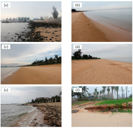 On-site photos of Haikou Bay: (a) beach with rocks; (b) beach at high tide; (c) beach at middle tide; (d) beach at low tide; (e) beach bounded by seawall; (f) dune covered by vegetations.
