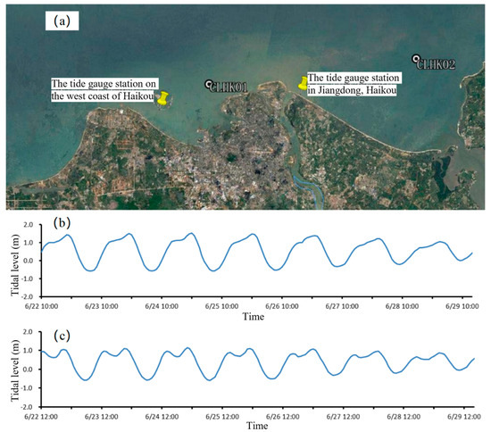 Schematic diagram of hydrological monitoring stations in Haikou and tide level time series: (a) locations of tidal stations; (b) time series of tidal levels at the west coast of Haikou; (c) time series of tidal levels at Jiangdong, Haikou.