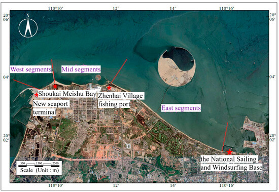 The LITLINE module’s governing equation is solved using the finite difference method, with the corresponding variables configured on a horizontally equidistant staggered grid. The grid spacing for shoreline calculation is 5 m. The model was used to simulate and calculate the shoreline deformation of Haikou Bay for 5, 10, and 20 years. The sediment transport rate input was obtained by interpolating sediment transport tables at spatial points calculated in advance using the LITTABL module. The transverse profiles of the shoreline and beach terrain used during model calculation were generated by interpolating data from naval charting department charts, C-map electronic charts, and surveyed terrain data near the project. The calculation area covered the shoreline from the new seaport terminal to the National Sailing and Windsurfing Base, bounded by the construction of the Meishu Bay near the Shoukai Bay area and the Zhenhai Village fishing port. The calculation area was divided into the western, middle, and eastern sections, as shown in Figure 5.