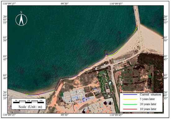 Figure 7 presents the simulation results regarding the shoreline’s evolution in the middle section of Haikou Bay. This section lies between the protruding structures of Shoukai Meishuwang Bay and Zhenhai Village Fishing Port, with a net sediment transport direction from east to west, amounting to approximately 8000 m3 per year. Due to the sheltering effect of the protruding structures near Shoukai Meishuwang Bay, the sediment transport directions on the eastern and western sides of the protrusion are conflicting. This section is further divided into multiple sediment transport units by coastal buildings. In the left unit, significant accumulation occurs on both sides of the protruding structures, with the sediment primarily transported from east to west, creating zones of high deposition. Similar behavior has been observed in other coastal studies [37], where artificial structures led to localized patterns of sediment buildup and erosion.