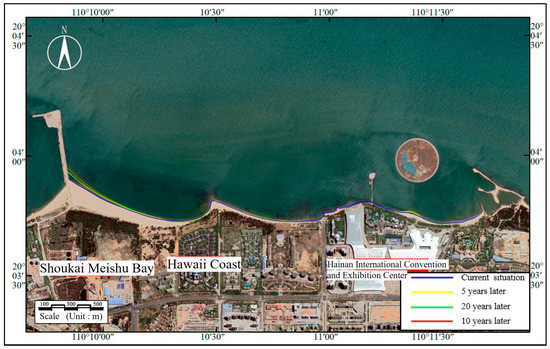 Calculated results regarding shoreline evolution in eastern section of Haikou Bay.