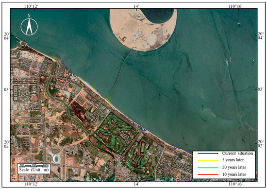 Figure 8 illustrates the simulation results regarding the shoreline’s evolution in the eastern section of Haikou Bay. The eastern shoreline is located between the Zhenhai Village Fishing Port and the National Sailing and Windsurfing Base, with the construction wharf of Mingzhu Island as the dividing point. The sediment transport direction on the western side of the construction wharf is from west to east, with an annual net sediment transport volume of approximately 13,000 m3. On the eastern side, the sediment transport direction is from east to west, with an annual net sediment transport volume of approximately 10,000 m3. The eastern shoreline shows significant accumulation in the wave shadow zone of the Phase 2 artificial island, with sediment transport along the coast from both the eastern and western sides of the wave shadow zone toward the center. The sediment accumulation in the wave shadow zone reflects a common phenomenon associated with artificial structures. Research on sandy beaches, such as those in the Caribbean and the Mediterranean, has shown that artificial islands and other coastal structures can significantly disrupt the natural sediment transport processes, leading to both erosion and deposition in unexpected areas [37].