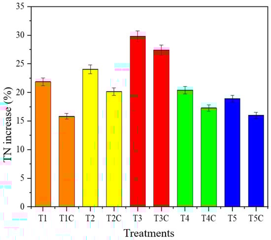 TN is important in determining the quality of composting. Previous studies have demonstrated that the nitrogen mineralization rate significantly influences plant growth []. Furthermore, through optimization of conditions and additives, it is possible to enhance the nitrogen content in composting, thereby improving its efficacy as an agricultural nitrogen fertilizer []. The change in TN during composting directly reflects the agricultural value of the resulting composting product. The TN levels increased for all samples before and after composting. As depicted in Figure 2, T1~T5 exhibited increases in TN of 18.90% to 29.80%, whereas T1C~T5C demonstrated an increase of 15.83~27.40%. Notably, within T3 and T3C, T3 displayed the highest increment of 29.80% in TN levels, while T3C had a lower increase of 27.40%. Regarding the nutritional quality of the compost product, treatment T3 demonstrated a higher potential for resource recovery. Therefore, further process optimization should focus on maximizing beneficial effects of T3. The variation observed in TN suggested that vermicomposting using wasted sludge and kitchen waste as substrates yields higher agricultural value compared to ordinary composting under identical environmental conditions. The microbial-level study will contribute to elucidating the rationale underlying the earthworm’s enhancement of compost quality.