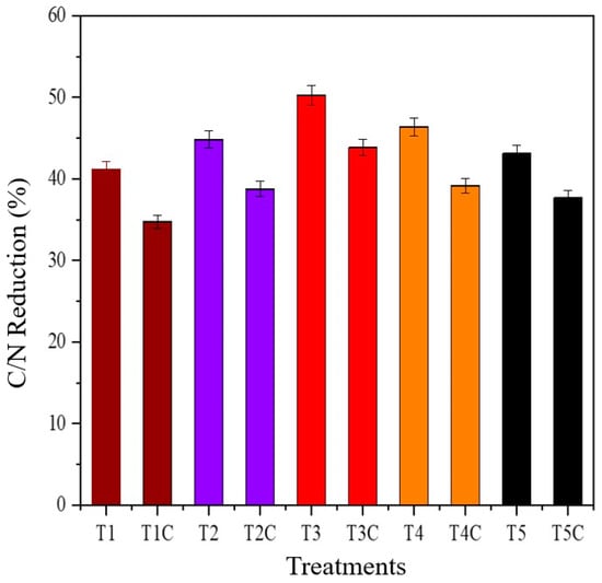 The C/N ratio is a key factor affecting the composting quality []. During the composting process, the carbon content in the raw materials exceeds that of nitrogen, providing an optimal environment for microorganisms. As organic matter decomposes, carbon is released as carbon dioxide, while nitrogen is retained in the composting, leading to a gradual reduction in the C/N ratio. When reaching humification, easily degradable carbon sources are largely depleted. A high C/N ratio limits the availability of nitrogen necessary for microbial growth and reproduction, resulting in inefficient humification. Through investigation into dynamic changes in C/N during composting, researchers have developed methods to optimize the humification process, such as incorporating sawdust or bulking agents []. Figure 3 illustrates a general decrease in C/N due to reductions in TOC and increases in TN. Previous experiments have demonstrated the promising effect of T3, indicating its potential utility in the treatment of organic solid waste. The C/N reduction percentage of T3 reached a maximum of 50.26%, while the minimum reduction was 41.18% for T1, which is consistent with previous observations. The C/N reduction percentage was T3 > T4 > T5 > T2 > T1. The C/N ratio serves as an essential indicator for assessing the stabilization and maturity of compost. In all experiments, the C/N degradation percentage of experimental treatments (T1~T5) exceeded that of corresponding ordinary compost (T1C~T5C), supporting the idea that earthworms can enhance the stability and maturity of composting. More importantly, T3 demonstrated a more substantial reduction in the C/N ratio than T3C, suggesting its potential to reach the higher level of maturity when subjected to a balanced mass ratio of wasted sludge to kitchen waste.