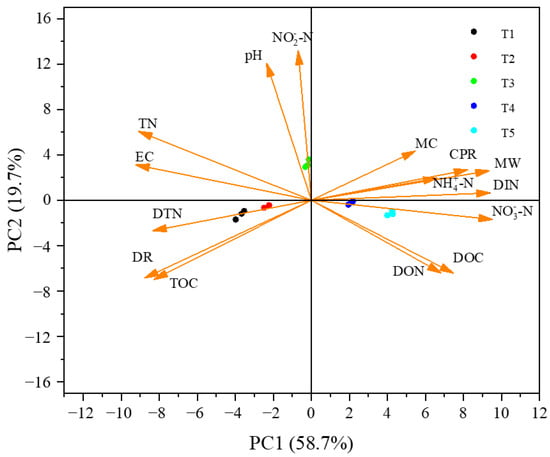 To further elucidate the impact of different proportions of wasted sludge and kitchen waste on the treatment effect, this study performed principal component analysis on the physicochemical properties, including 15 parameters. Principal Component 1 (PC1) and Principal Component 2 (PC2) were depicted in Figure 4. The sum of the two components was approximately 80%.