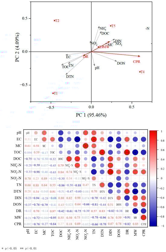 The results indicated that T3 was positioned in the second quadrant, signifying a positive correlation with PC2, while T1, T2, T4, and T5 were in the third and fourth quadrants. Therefore, PC2 was considered to represent the variation in variables resulting from different proportions of compost substrate materials. In other words, the varying proportions had a significant influence on the physicochemical properties of vermicomposting. In addition, PC1 was strongly associated with most parameters; however, it did not display a significant correlation with NO−2-N and pH. This suggested that the different proportion of substrate had a greater impact on most studied physicochemical factors, as well as the physiological and ecological characteristics of vermicomposting, while having minimal influence on nitrate nitrogen and pH in composting.