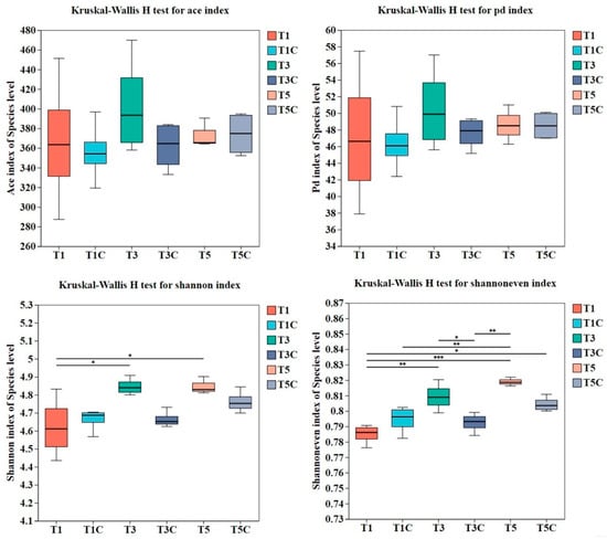 Alpha diversity index disparities (0.01 < p ≤ 0.05 *, 0.001 < p ≤ 0.01 **, p ≤ 0.001 ***).