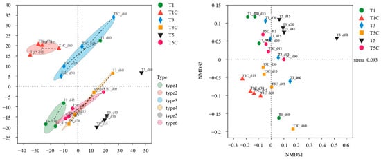 The analysis for changes in bacterial community structure includes both Alpha and Beta diversity analysis. Alpha diversity analysis examines the richness and diversity within the community. Beta diversity analysis investigates the similarity of communities across different samples based on distance []. In this study, NMDS analysis was employed to illustrate the ecological similarity between communities.