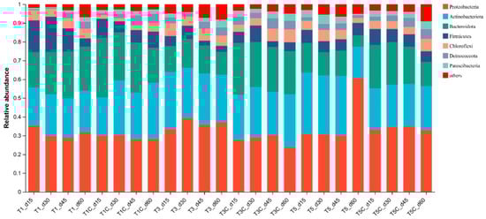 Figure 1 illustrates these degradation results. After a 60-day composting cycle, T1~T5 exhibited an average TOC degradation rate of approximately 32.62%, while T1C~T5C showed an average degradation rate around 27.13%. The discrepancy in the rate of TOC degradation between T3 and T3C was the most substantial among all the samples. The TOC degradation rate for T3 was determined to be 35.44%, whereas for T3C, it was observed as 28.45%. The decrease in TOC during composting is attributed to the degradation of organic matter by microorganisms, which is essential for their metabolic processes []. Vermicomposting products had higher biological activities induced by the synergistic effect of microorganisms and earthworms []. The results demonstrated that the synergistic action of earthworms and microorganisms promotes the degradation of organic matter. Furthermore, comparison of TOC degradation rates among treatments T1~T5 revealed that T3 ≈ T4 > T5 > T2 > T1. A lower TOC content in composting indicates a higher presence of humic acid and greater stability []. In addition, the mass ratio of wasted sludge and kitchen waste is essential to the biodegradability. T3 and T3C warranted greater attention as a synergistic pollutant combination, proving the potential to optimize the composting process through an equal mass ratio of substrate materials []. This was attributed to the high content of active microorganisms in wasted sludge, leading to a higher rate of TOC degradation. However, an excessive amount of wasted sludge can lead to a reduction in the overall carbon source concentration, which adversely affects the growth of microorganisms. In the present test, T3 exhibited enhanced degradability of TOC, outperforming ordinary composting. To elucidate the underlying mechanisms for this superior degradability, a comprehensive understanding of the bacterial role in the degradation of solid pollutants is imperative.